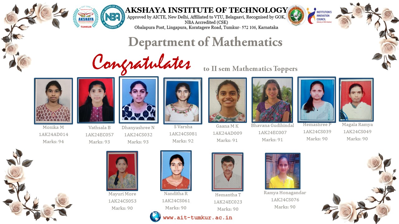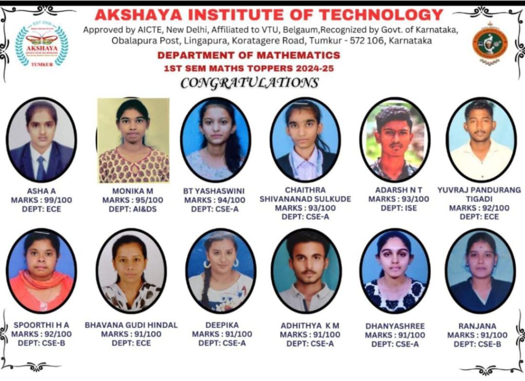 The Mathematics Department offers a broad and challenging academic program that supports the vision of Visvesvaraya Technological University. We aim to provide high-quality education in undergraduate and graduate mathematics.